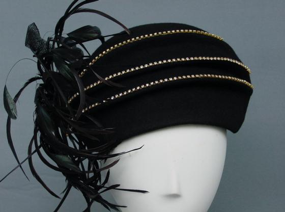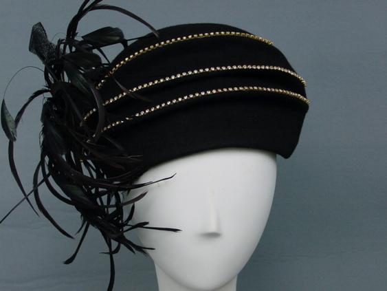 Turban Pillbox with Feathers & Rhinestones...Shown in Black. Standard Sized 22.5"