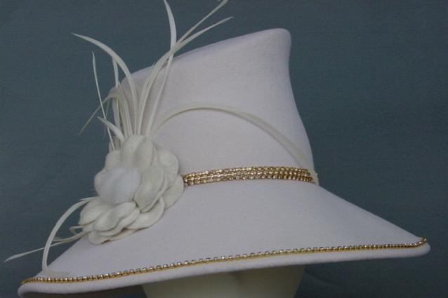 Medium Brimmed Felt with Felt Flower, Feathers, Rhinestones & Mink Trim...Shown in Ivory. Standard Sized 22.5"