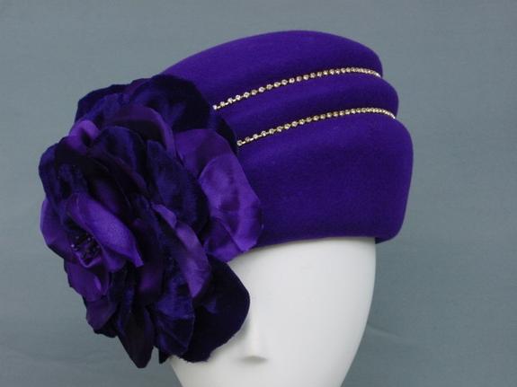 Turban Pillbox with Flower & Rhinestones...Shown in Purple. Standard Sized 22.5"