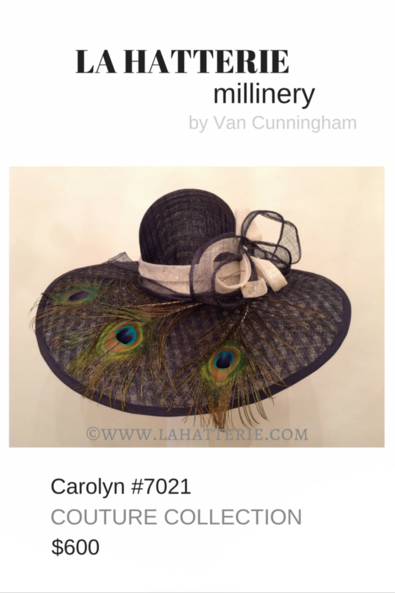 Navy Blue & Off White Sinamay Large Brim Hat with Feathers.