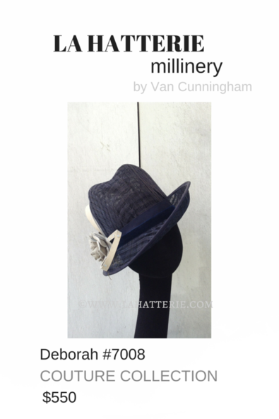 Navy Sinamay Fedora with Leather Flower & Feather Trim.