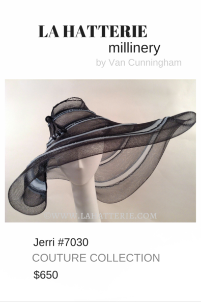 Black & Light Blue Large Brim Horsehair Open Crown Hat with Beaded Trim.
