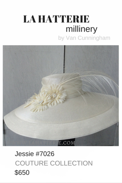 Ivory Tonal Large Brim Braid Hat with Feather, Flower & Rhinestone Trim.
