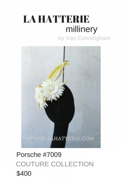 Yellow & Off White Sinamay Fascinator with Flower, Rhinestone & Feather Trim.